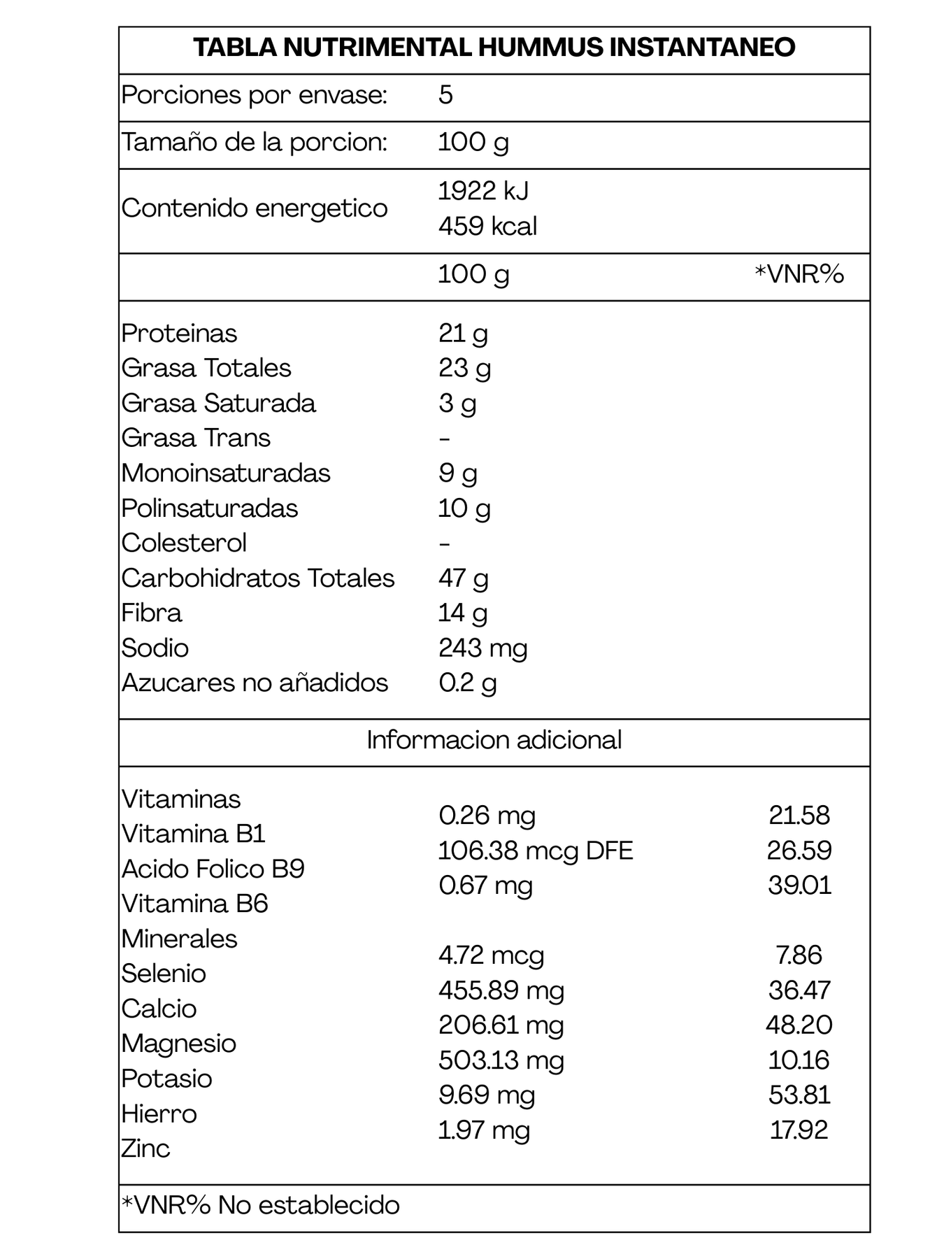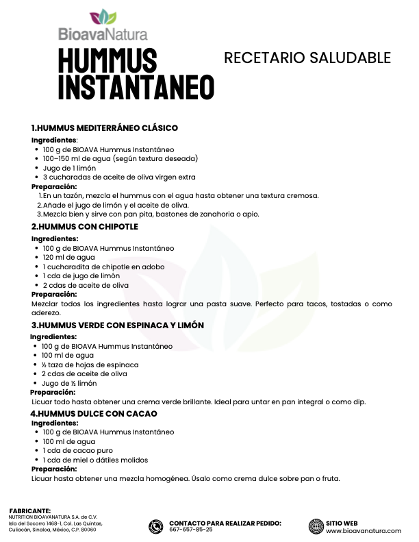 Es un alimento funcional de origen vegetal que ofrece una alternativa práctica, nutritiva y deliciosa al tradicional hummus mediterráneo. Su fórmula está elaborada a base de garbanzo extruido, ajonjolí tostado , ajo y una mínima cantidad de sal , logrando un balance perfecto entre sabor, nutrición y facilidad de preparación.