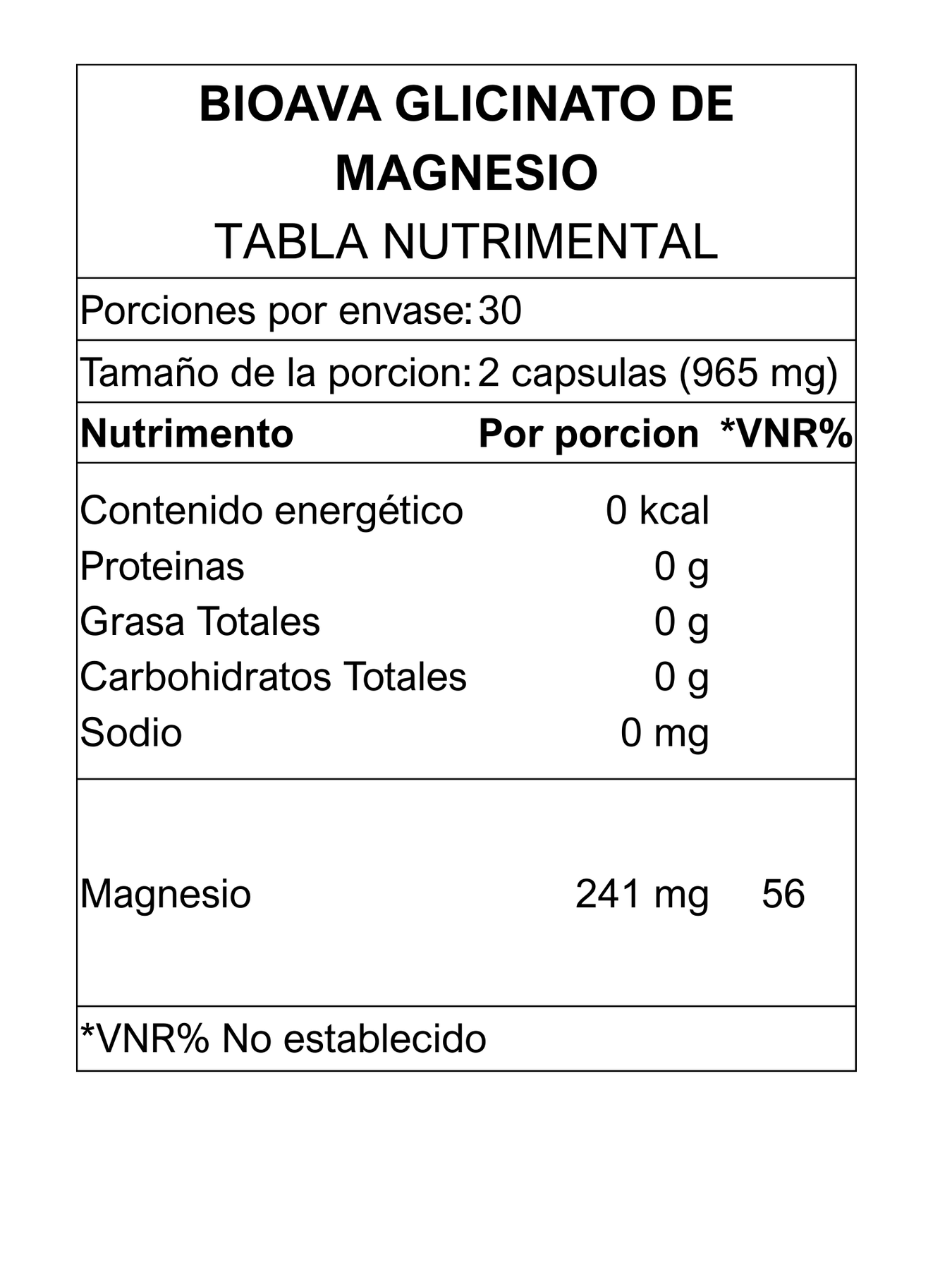 Tomar 2 cápsulas de BIOAVA GLICINATO DE MAGNESIO al día. Porción por envase 30 porciones. Presentación 60 cápsulas.
